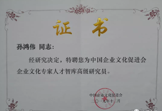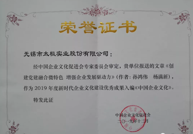 12月5日,“认真学习贯彻十九届四中全会精神,建设高质量企业文化研讨会暨中国企业文化促进会2019工作年会”召开,太极实业申报的《创建党建融合微特色,增强企业发展驱动力——无锡市太极实业股份有限公司党建工作探索与实践》荣获2019新时代企业文化建设优秀成果,并入编《中国企业文化》。同时,鉴于太极实业党委书记、副董事长、总经理孙鸿伟在企业党建文化建设上的有益探索和积极贡献,其个人被中国企业文化促进会特聘为企业文化专家人才智库高级研究员。