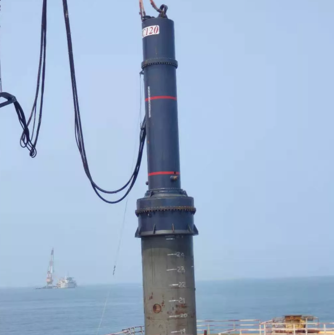 除了嵌岩基础施工,沙扒项目直接打入基础施工也十分重要。在直接打入基础沉桩施工过程中,为提升施工效率,项目部和施工单位创新使用夹桩器和C型钩配合这一更为科学且有针对性的方案,从而有效减少钢管桩起吊和翻身时间。项目在刚开始施工时采用的是常规施工工艺,即先插2根桩,沉桩完成后,主浮吊移船,运输船再靠船,插另外2根桩后再沉桩。为提高沉桩施工效率,结合项目已沉桩的施工经验,项目部和施工单位决定后续部分机位采取一次直接插4根桩后再分两次沉桩的方案实施,有效减少了运输船靠船时间,进一步优化了施工工艺。