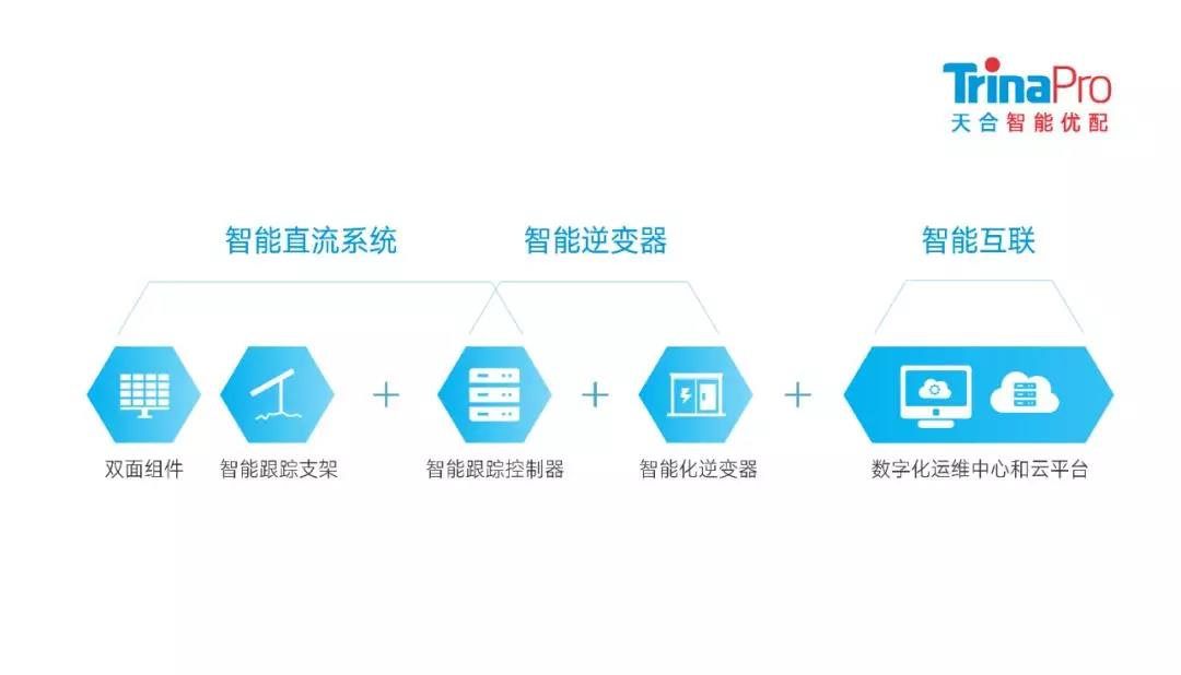 除了考虑组件技术的应用与选择,如何提高发电系统的整体效率,降低系统成本,从而进一步降低度电成本,亦是平价上网时代需要解决的难题。智能化程度低、可靠性低、软硬件匹配不精准等问题是阻碍系统发电量提升的主要因素。针对这些问题,天合光能在2018年推出集成了高效双面组件+智能跟踪系统+智能逆变器的直流侧解决方案——TrinaPro天合智能优配。天合智能优配优选高功率、高可靠的双面组件,叠加了MBB、切半、大硅片等技术,提升组件功率的同时还可以降低系统成本。