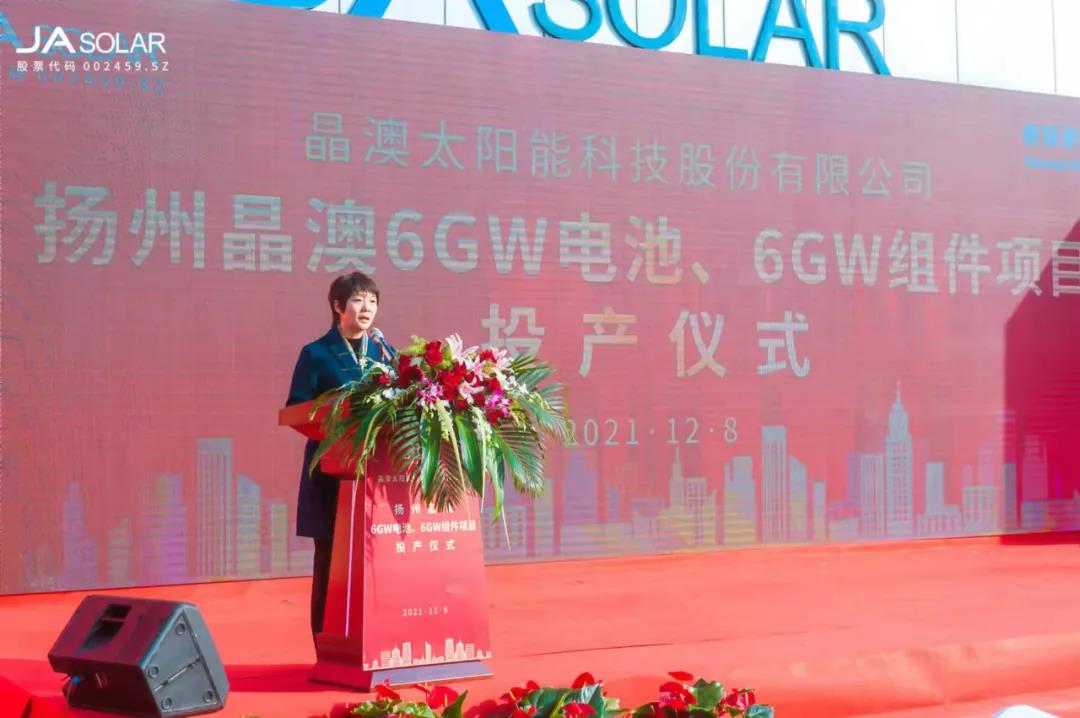 张宝娟书记在讲话中充分肯定了晶澳科技作为光伏龙头企业对新能源产业所作出的贡献,对新项目投产表示了祝贺,并指出,新项目对扬州产业转型升级,实现高质量发展具有十分重要的意义。市委、市政府将与晶澳科技一道,共同推动新能源产业做优做强。