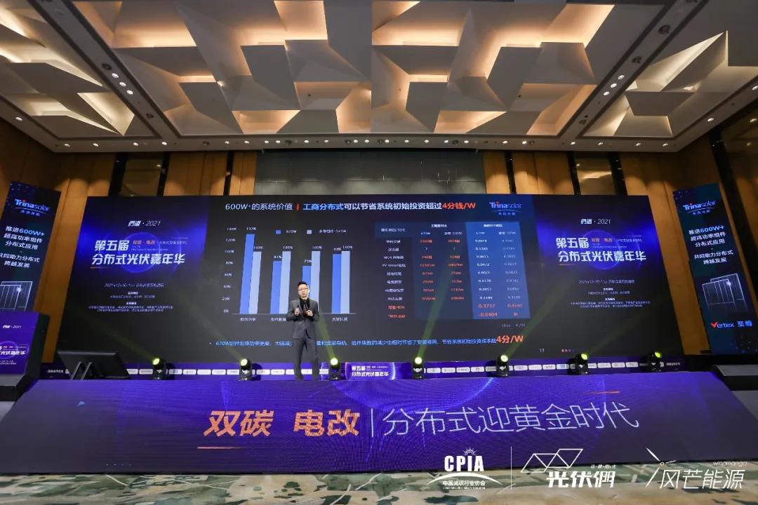 天合光能全球产品及市场负责人张映斌博士在演讲中深度剖析了以600W+为代表的超高功率组件对于分布式应用场景的显著价值及影响;并就太阳能在分布式场景下快速发展的大背景,分析了分布式光伏的发展趋势和市场格局;还与行业专家深入讨论了未来影响分布式光伏开发、投资模式的因素、整县推进示范的实施要点及行业影响。