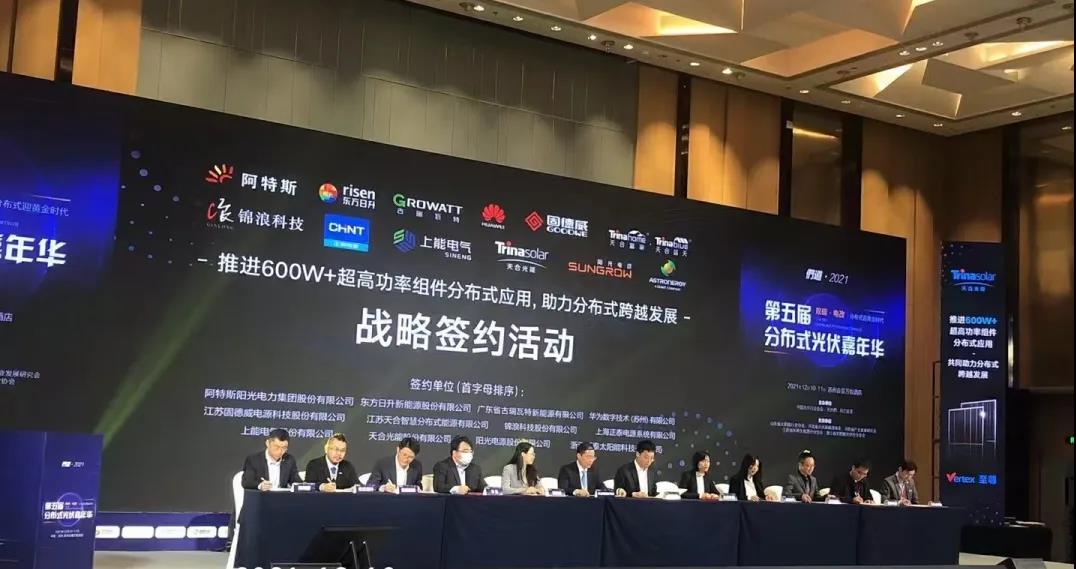 在“双碳”目标和绿色低碳转型的大背景下,提高可再生能源应用比重和提升清洁能源消费比重,成为能源发展的必然趋势。12月初,工信部发布“十四五”最新规划,更是明确鼓励开展屋顶光伏建设,发展大尺寸高效光伏组件!为了进一步推动分布式光伏发展,12月10日,天合光能、天合智慧分布式与全球领先光伏组件企业阿特斯、东方日升、正泰太阳能、以及固德威、古瑞瓦特、华为、锦浪、上能电气、阳光电源和正泰电源7家主流逆变器厂商(按首字母排序),进行了战略签约,联合声明共同推进600W+超高功率组件分布式应用,构建600W+分布式应用体系,推动分布式产业结构高端化、分布式能源消费低碳化转型。
