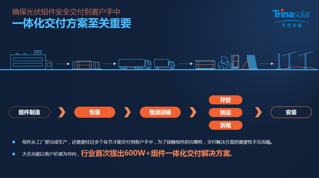 此次项目运输方式为国内标准化的平板车运输,600W+超高功率组件采用传统的横式包装。天合具备了一体化的包装-物流-交付体系,环环相扣,层层把关,旨在将组件安全迅速交付到客户手中。