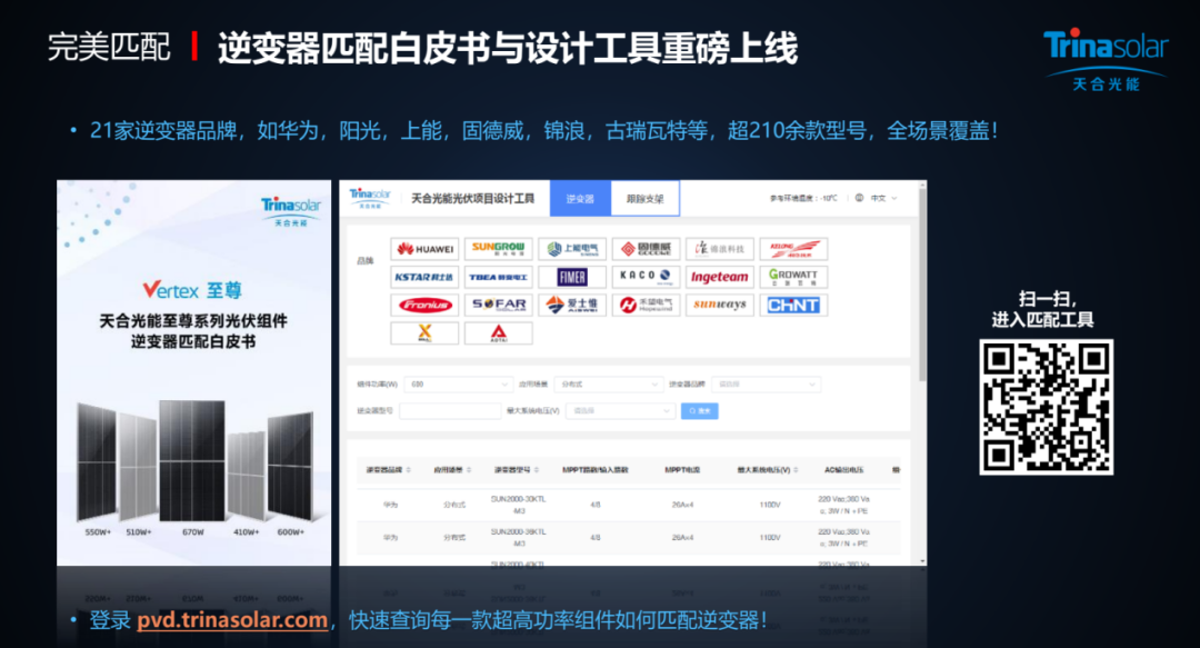 基于对光伏电站三大主材之一的逆变器匹配的重视,天合光能与600W+联盟成员合作完成并发布了正式发布的《天合光能至尊系列光伏组件逆变器匹配白皮书》暨全球范围内光伏行业首个逆变器智能匹配数据库,在逆变器全面适配210至尊全系列组件后,为不同应用场景的逆变器匹配提供清晰参考,为超高功率组件分布式应用铺平道路。天合推出的首个逆变器匹配工具(pvd.trinasolar.com)也成为了210超高功率组件上屋顶的有力武器,一经推出便广受好评。