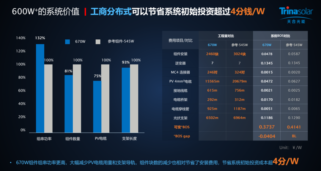 就在近期,国内权威测算专家对210至尊系列组件全场景度电成本优势和收益进行了深入研究: 600W+至尊系列组件的系统成本与度电成本均优于行业参考450W和545W组件。在户用分布式场景下,至尊600W组件对比参考450W组件,节省初始投资成本达到6.15分/W,而且由于组件功率提升,安装块数减少,使得至尊600W组件年节省租金3.3分/W。在工商分布式场景下,至尊670W组件对比参考545W组件,节省系统初始投资超过4分钱/W。