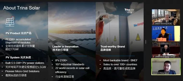 近日,由中国国际商会和澳大利亚中国工商业委员会共同主办的中澳企业家圆桌对话会在线上举办,天合光能亚太电站创团总经理李鹏受邀参会,同中国石油、山东能源、中铝海外、五矿有色、中钢集团、力拓集团、澳新银行、必和必拓、FMG公司、澳赛德能源等中澳企业代表,共同围绕“中澳工商界在应对气候变化中的新兴角色和机遇”主题进行了对话与交流。
