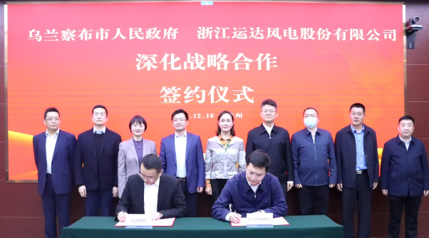 12月16日,浙江运达风电股份有限公司与乌兰察布市人民政府在杭州举行深化战略合作签约仪式。乌兰察布市市委副书记、市长奇飞云,机电集团党委副书记、总经理杨震宇出席仪式并致辞。