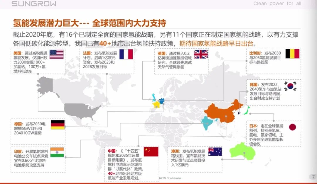 根据报告,截止2020年底,有16个国家已制定全面的国家氢能战略,另有11个国家正在制定国家氢能战略,以有力支撑各国低碳化能源转型。我国已有40+地市出台氢能扶持政策,行业期待国家氢能战略早日出台。