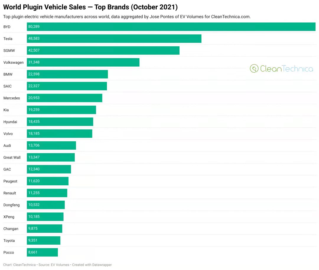 全球市场数据上,虽然现在是12月份,但是由于数据庞大统计难度高,全球电动汽车市场的销量公布都相对滞后。据外媒CleanTechnica统计,2021年10月全球电动汽车销量同比增长70%至589663辆,占全球汽车市场8.8%,其中纯电动车销量为416000辆,占全球电动汽车销量79%,占汽车市场的6.2%。