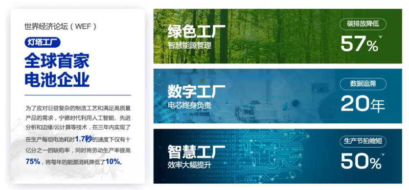 在极限制造方面,今年9月,宁德时代工厂被世界经济论坛评为全球“灯塔工厂”,成为全球首个获此认可的电池工厂。世界经济论坛给我们的评选语是,为应对日益复杂的制造工艺,满足高质量产品需求。宁德时代利用人工智能先进分析,边缘计算和云计算等技术,可以每1.7秒生产一个电池,缺陷率仅有十亿分之一,同时将劳动生产率提高了75%,能源消耗降低了10%。