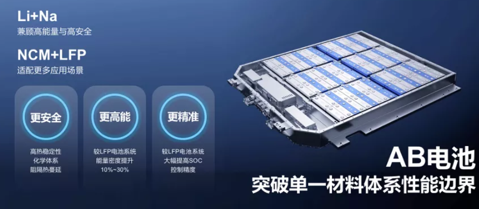 在结构创新方面,我们团队基于BMS的全新算法,提出并实现了在单个电池包中布置AB两种不同电芯的设计方案,AB既可以是铁锂+三元,也可以是锂电池+钠电池,还可以是其他更多种不同组合的混搭。这种设计突破了单一材料体系性能边界,实现优势互补,为客户提供更全面的解决方案。