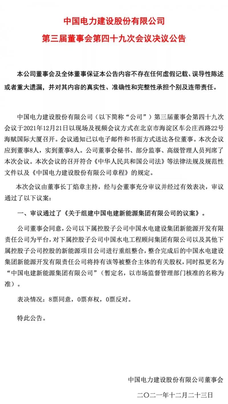 12月22日,中国电力建设股份有限公司发布《第三届董事会第四十九次会议决议公告》。根据公告,董事会会议审议通过了《关于组建中国电建新能源集团有限公司的议案》。