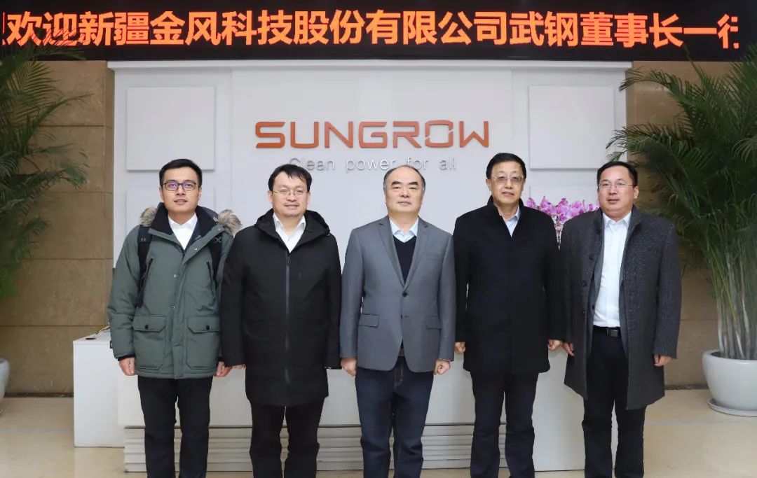 1月5日,新疆金风科技股份有限公司董事长武钢一行到访阳光电源,与阳光电源董事长曹仁贤座谈。双方就“十四五”期间进一步加大新能源领域全球合作展开深入交流,达成一系列重要共识。金风科技风电产业集团副总经理陈秋华,阳光电源副总裁彭超才等出席座谈会。