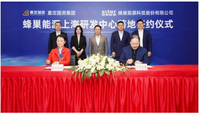 上海市嘉定区副区长李峰、嘉定区投促中心副主任蔡燕、蜂巢能源董事长兼CEO杨红新、上海市嘉定国资集团党委书记、董事长严凌,嘉定国资集团党委副书记、总经理樊珠等双方领导出席签约活动。
