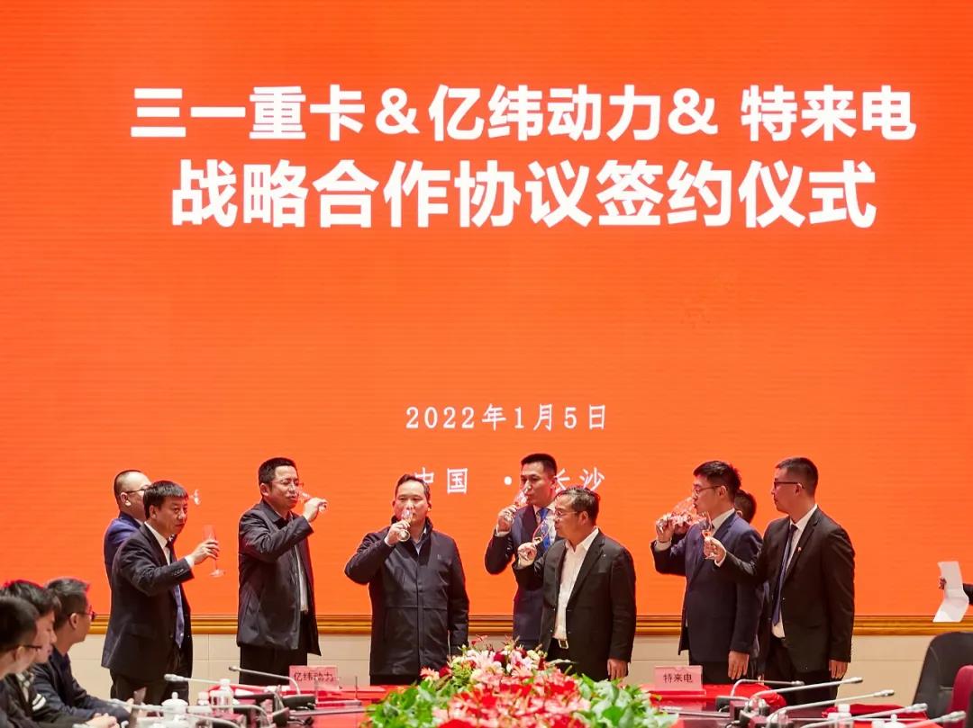 跨入2022年,三一新能源再传喜讯!1月5日,三一重卡与湖北亿纬动力有限公司(以下简称“亿纬动力”)、特来电新能源股份有限公司(以下简称“特来电”)于长沙正式签署战略合作协议,强强联合,共谱2022三一电动重卡战略合作新篇章!