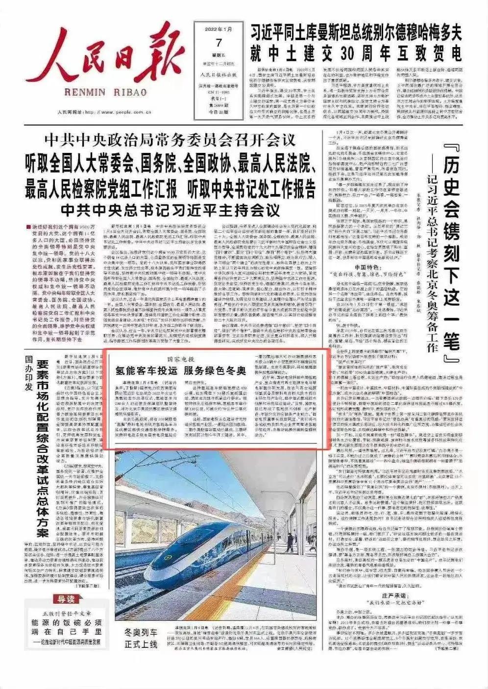 《人民日报》头版刊登《国家电投:氢能客车投运 服务绿色冬奥》,全文如下: