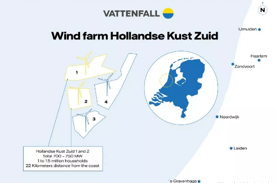 Hollandse Kust Zuid项目装机容量1.5GW,是全球首个零补贴海上风电项目,将安装140台11MW风机。