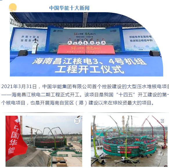 2021年3月31日,中国华能集团有限公司首个控股建设的大型压水堆核电项目——海南昌江核电二期工程正式开工。该项目是我国“十四五”开工建设的第一个核电项目,也是开展海南自贸区(港)建设以来在琼投资最大的项目。