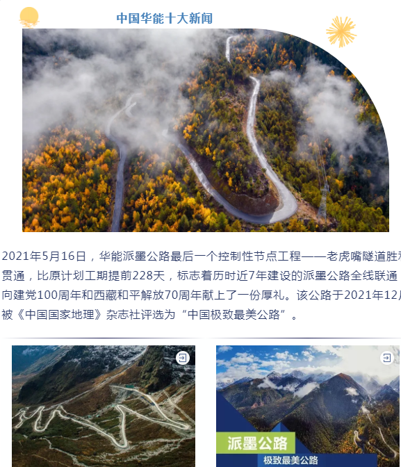 2021年5月16日,华能派墨公路最后一个控制性节点工程——老虎嘴隧道胜利贯通,比原计划工期提前228天,标志着历时近7年建设的派墨公路全线联通,向建党100周年和西藏和平解放70周年献上了一份厚礼。该公路于2021年12月被《中国国家地理》杂志社评选为“中国极致最美公路”。