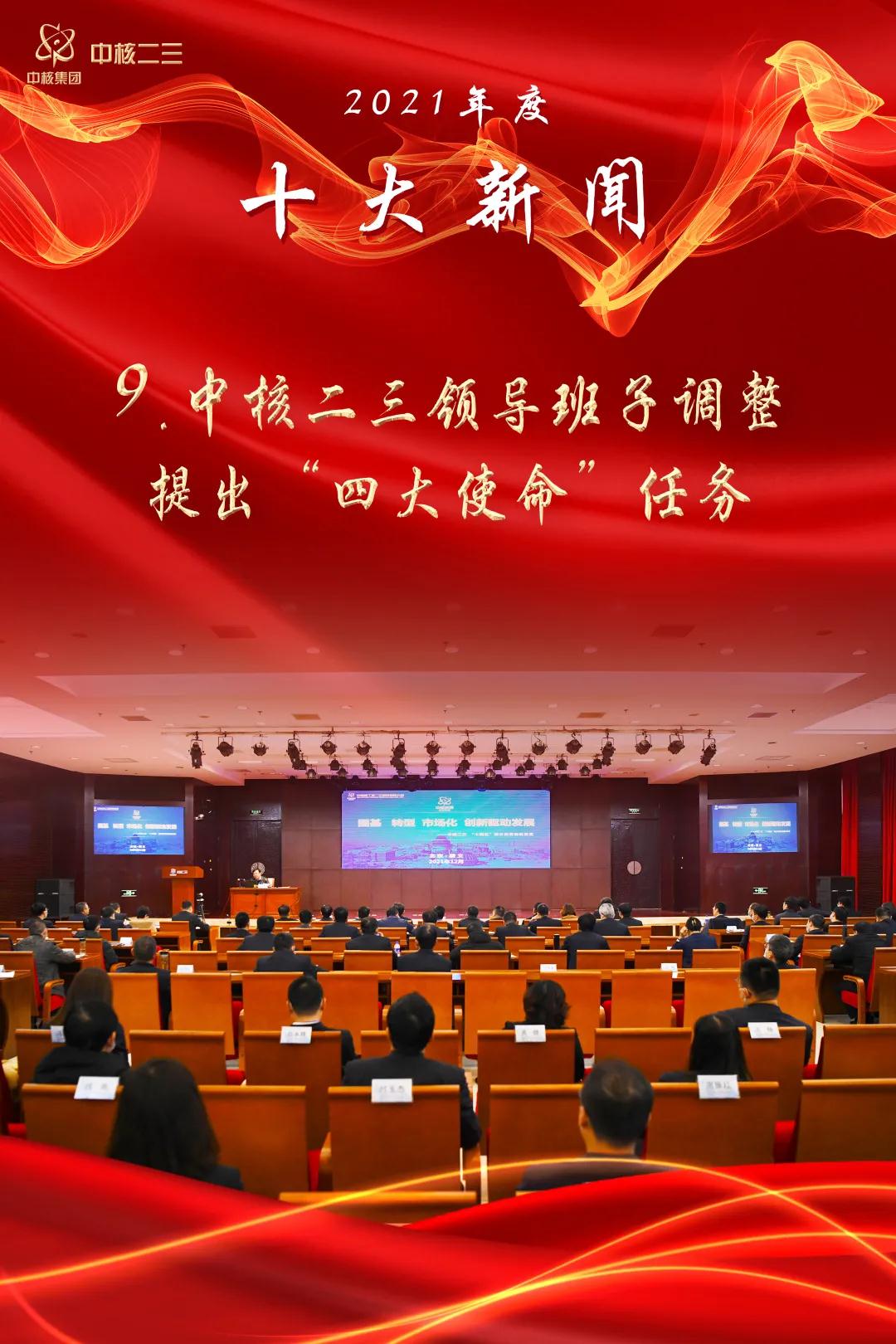 2021年12月9日,中核二三召开领导班子调整宣布大会,中核集团党组决定:李启彬任公司党委书记,推荐李启彬为公司董事长,推荐王虎为公司副总经理。同年8月,陆文江任公司党委副书记。12月18日,公司举行“十四五”发展规划宣贯会,提出新一届领导班子“四大使命”任务:一是构建“235”产业布局,实现主责主业新突破;二是推动项目“精益化、自动化、数字化”管理上台阶;三是“结构优、质量优”产业队伍建设水平显著提高;四是完成高质量指标考核常态化、全覆盖。“四大使命”任务是在找准公司在核工业体系中的定位、总结公司历史经验、深入分析公司当前主要矛盾、系统谋划“十四五”乃至更长期时期发展的基础上提出的,是公司提升核心竞争力的需要,是更大程度满足客户的需要,更是助力中核集团、中国核建实现“十四五”规划目标的需要。