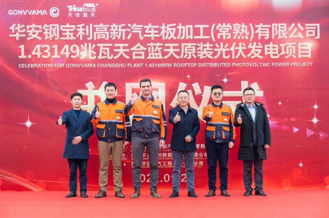 2022年1月25日,华安钢宝利投资有限公司与天合蓝天合作的1.4MW原装工商业项目并网仪式在常熟正式举行。GONVVAMA CEO奥兰多先生、副COO曾广忆先生、常熟工厂厂长孙远辉先生、天合智慧分布式有限公司副总裁张荣敏先生、江浙公司总经理张平先生、江浙公司项目总监管铭华先生以及全体常熟工厂员工参加了此次仪式。