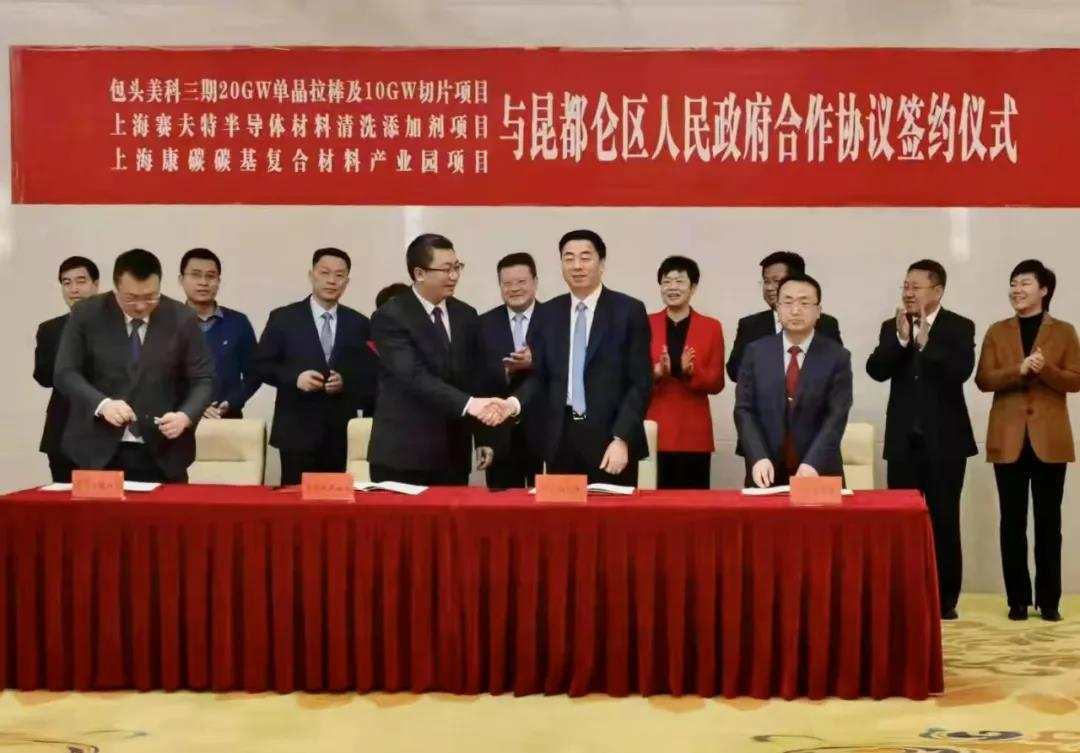 1 月 26 日,内蒙古自治区党委副书记、市委书记孟凡利会见了美科股份董事长王禄宝一行,双方会谈的同时进行了包头美科硅能源有限公司三期20GW单晶拉棒及10GW切片项目与昆都仑区人民政府合作协议签约仪式。市委常委、秘书长刘海泉,市政府党组成员王秀莲、市政府党组成员、发改委主任雷殿军,昆区区委书记金永丽,市工信局局长刘永明出席了本次签约仪式。