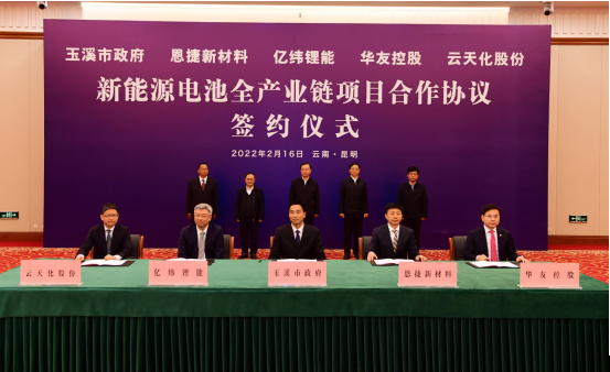 2月16日,亿纬锂能携手恩捷股份、华友控股、云天化等锂电上下游企业,与云南省玉溪市人民政府签订《新能源电池全产业链项目合作协议》。亿纬锂能董事长刘金成博士出席签约仪式。