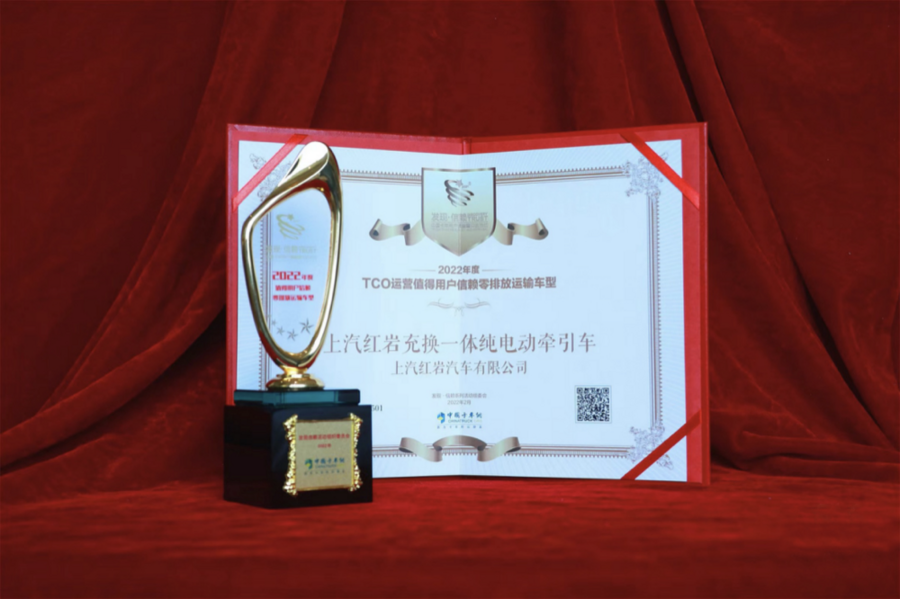 2022年2月22日,在中国卡车网主办的第七届“发现信赖中国卡车用户调查暨评选活动”颁奖盛典上,上汽红岩杰狮H6充换电一体牵引车凭借绿色、高效的运输解决方案,斩获“TCO运营值得用户信赖零排放运输车型”大奖。