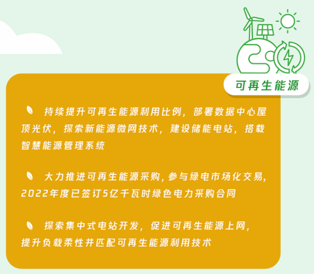 并大力推进可再生能源采购,参与绿电市场化交易,腾讯2022年度已集中签订共计5.04亿千瓦时绿电交易合同,锁定了6个风电光伏项目的年度部分发电量。