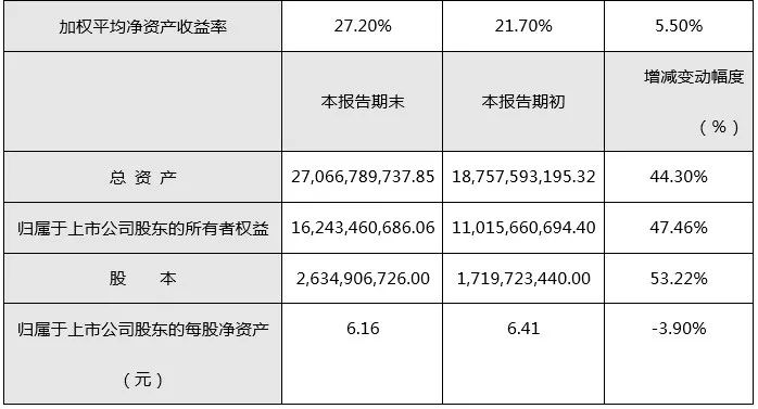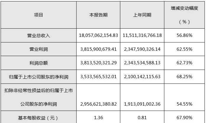2021年度,公司实现营业总收入18,057,062,154.83元,比上年同期增长56.86%;实现利润总额3,813,520,321.29元,比上年同期增长62.73%;实现归属于上市公司股东的净利润3,533,565,532.01元,比上年同期增长68.25%。