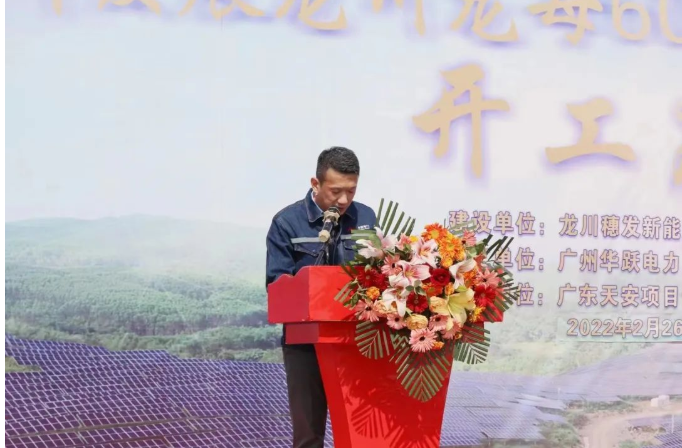 华跃电力总经理胡刚在致辞中表示,龙川龙母60MW林光互补项目不仅是华跃电力与广州发展新能源公司合作的又一新硕果,也是龙川县加快新能源产业开发建设的又一重大举措。华跃电力将继续发挥在光伏发电站建设方面积累的丰富经验,坚持以“标准化施工现场、规范化施工作业”为指引,高标准推进工程的高质量建设,打造精品项目。