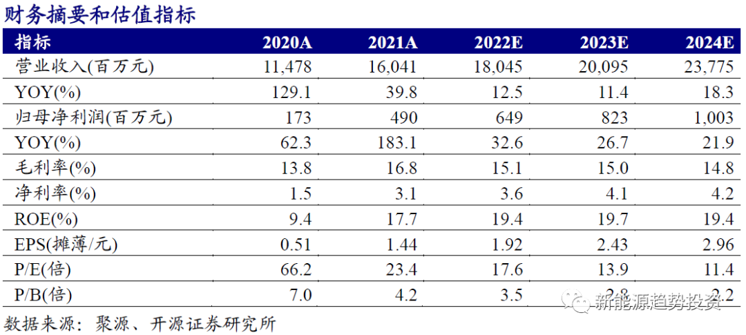 2021年公司新增订单12.80GW,累计在手订单12.88GW。2021年1-10月,运达股份在公开市场招标的中标份额为13.39%,中标份额已接近前三的企业。2021年3MW及以上机型销量占比超过67%,同比提升34pct。短期来看,结合2021年招标规模、两批大基地项目以及2023年有望迎来上行周期的海上风电,未来两年风电行业高景气周期已经开始确立。长期来看,结合风光发电量消纳目标、老旧风场改造升级,预计“十四五”期间我国风电年新增装机需求在55GW以上。尽管年内风机交付价格下行,但随着大机型的交付、市占率提升以及公司降本能力提升,公司有望迎来较好的业绩增长和保持领先的市场地位。