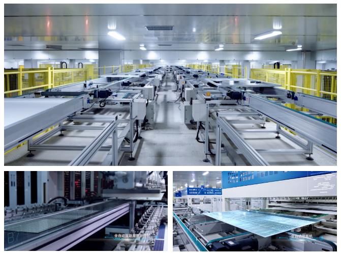 在组件环节,晶澳生产基地全部使用全自动双轨高速串焊机、双腔层压机全自动装框一体机和拥有工业级电脑智能控制多维度机械手的自动排版机等先进设备。在此基础上,晶澳的组件生产线得以具备较高的适应性,可实现生产全过程的智能联动,一键完成产品规格更换。