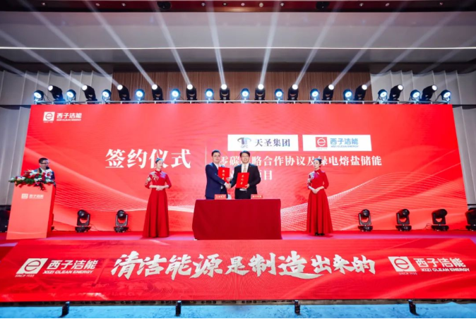 抓住能源结构转型的时代契机,更名仪式现场,西子洁能的最新动作也浮出水面:牵手浙江天圣控股集团,双方将在绍兴打造绿电熔盐储能项目。这也是西子洁能部署的首个零碳产业园项目。