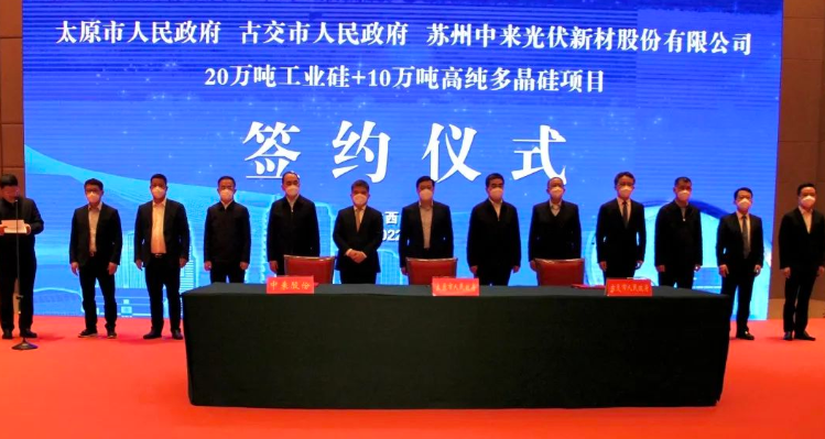 2022年3月15日,山西省太原市、古交市政府携手苏州中来光伏新材股份有限公司(以下简称“中来股份”)签署《战略合作与投资协议》,拟于古交市投资年产20万吨工业硅及10万吨高纯多晶硅项目,进一步深化山西省千亿级光伏产业链集群发展。山西省委常委、太原市委书记韦韬,市委副书记、市长张新伟共同见证项目签约。活动由副市长李永强主持,中来股份董事长林建伟介绍集团及项目有关情况,山西建投集团董事长孙波发言。国家开发银行山西省分行行长郭振兴,市领导刘俊义、刘鹓、薛维柱,中来股份徐林、陆卫东出席。