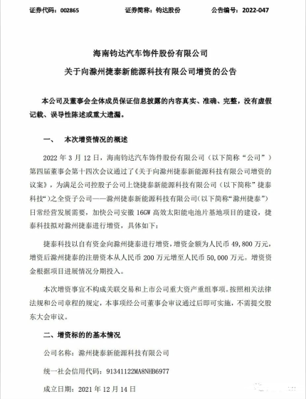 3月15日,钧达股份(002865.SZ)发布公告,为满足公司控股子公司上饶捷泰新能源科技有限公司之全资子公司——滁州捷泰新能源科技有限公司日常经营发展需要,加快公司安徽16GW高效太阳能电池片基地项目的建设,捷泰科技拟对滁州捷泰进行增资,具体如下: