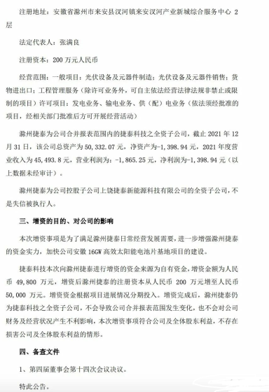 捷泰科技以自有资金向滁州捷泰进行增资,增资金额为人民币4.98亿元,增资后滁州捷泰的注册资本从人民币200万元增至人民币5亿元。增资资金根据项目进展情况分期投入。