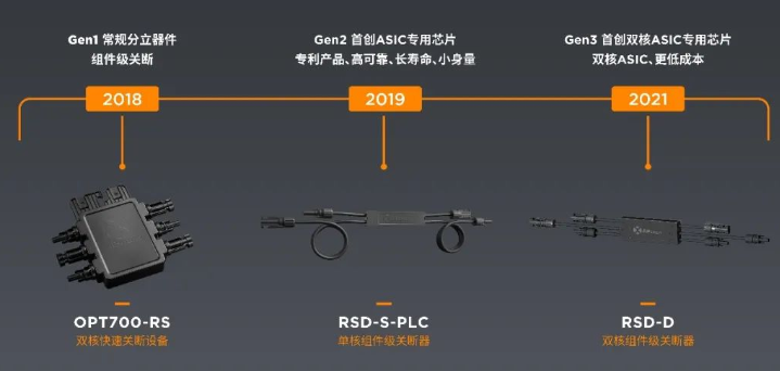 除了微型逆变器产品外,依托于技术背景优势,昱能在直流产品端也实现了多次跨越。2018年,昱能正式推出第一代组件级关断器产品,在光伏电站日常运维或火灾情况下,可实现组件级别的快速关断,使系统中无直流高压,保障了光伏系统的直流安全。