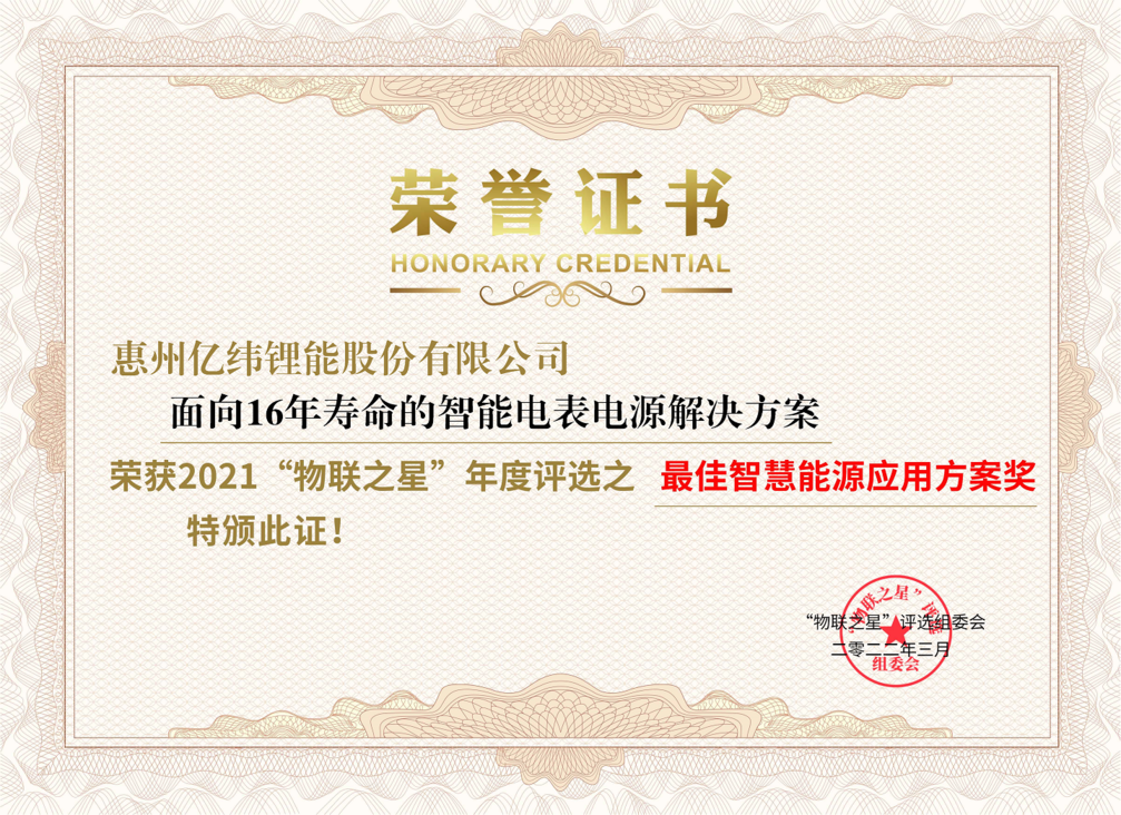 近日,2021“物联之星”中国物联网行业年度评选结果正式公布。亿纬锂能“面向16年寿命的智能电表电源解决方案”获得2021年“物联之星”年度评选之最佳智慧能源应用方案奖!