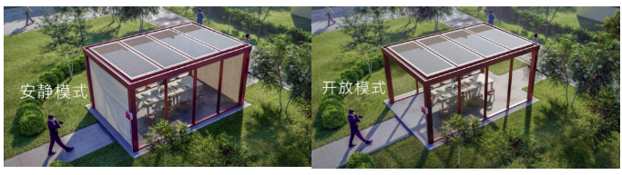同时,星宇顶适用于多场景阳光房,如布置了帷幔系统,顶上为可开启的产能模块,产能模块具有柔和透光的功能,但并不会在室内形成光斑。当帷幔和遮阳全部开启的状态下,它可以说是一座景观亭,路过的人们可以在这里小憩歇脚。对于这样一个集成主动产能、多样化空间的零碳阳光房,我们非常有信心。