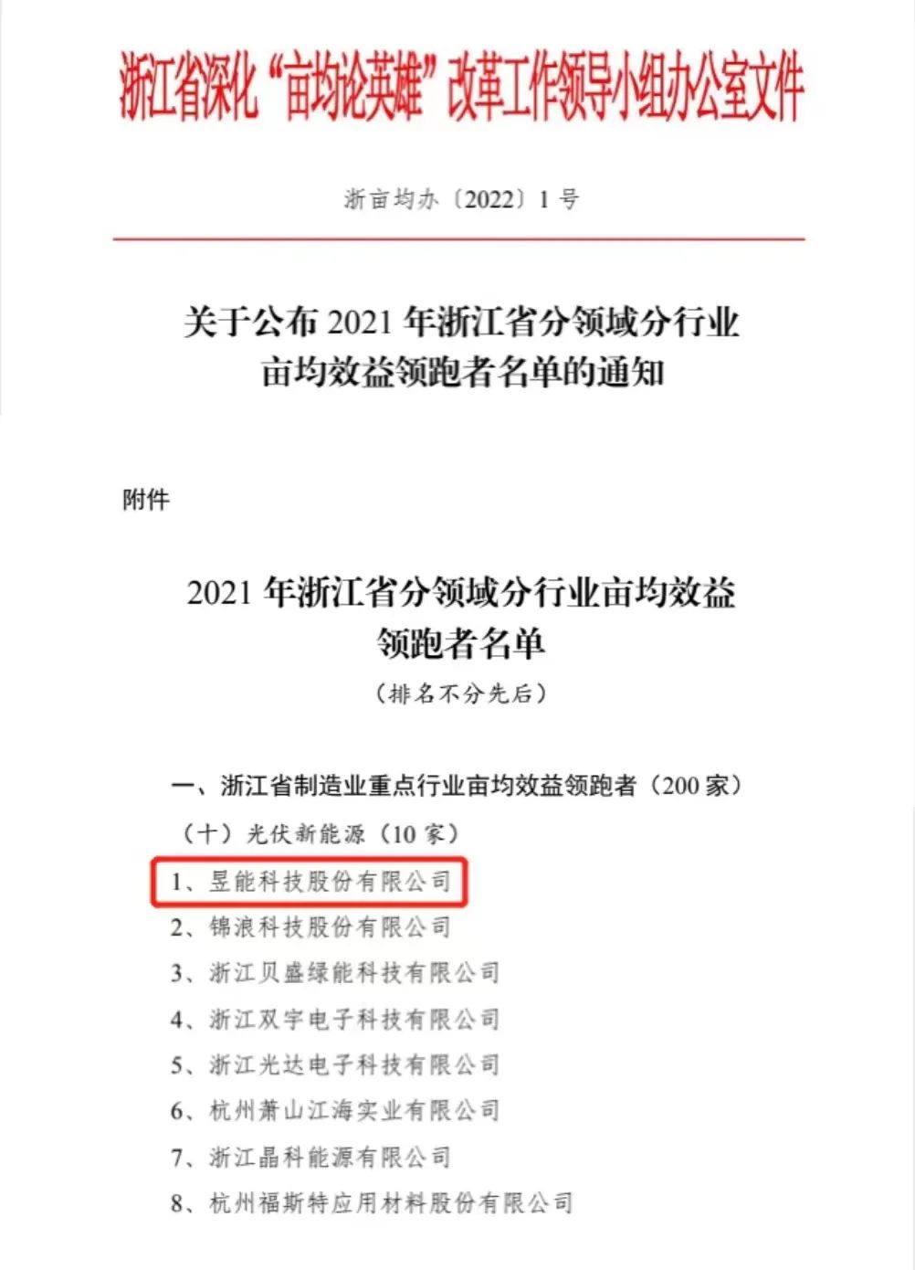 近日,浙江省深化“亩均论英雄”改革工作领导小组办公室公布了2021年浙江省分领域分行业亩均效益领跑者名单,昱能科技股份有限公司成功上榜,获“浙江省制造业重点行业亩均效益领跑者(光伏新能源)”荣誉。