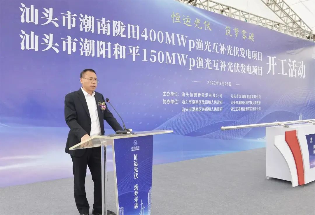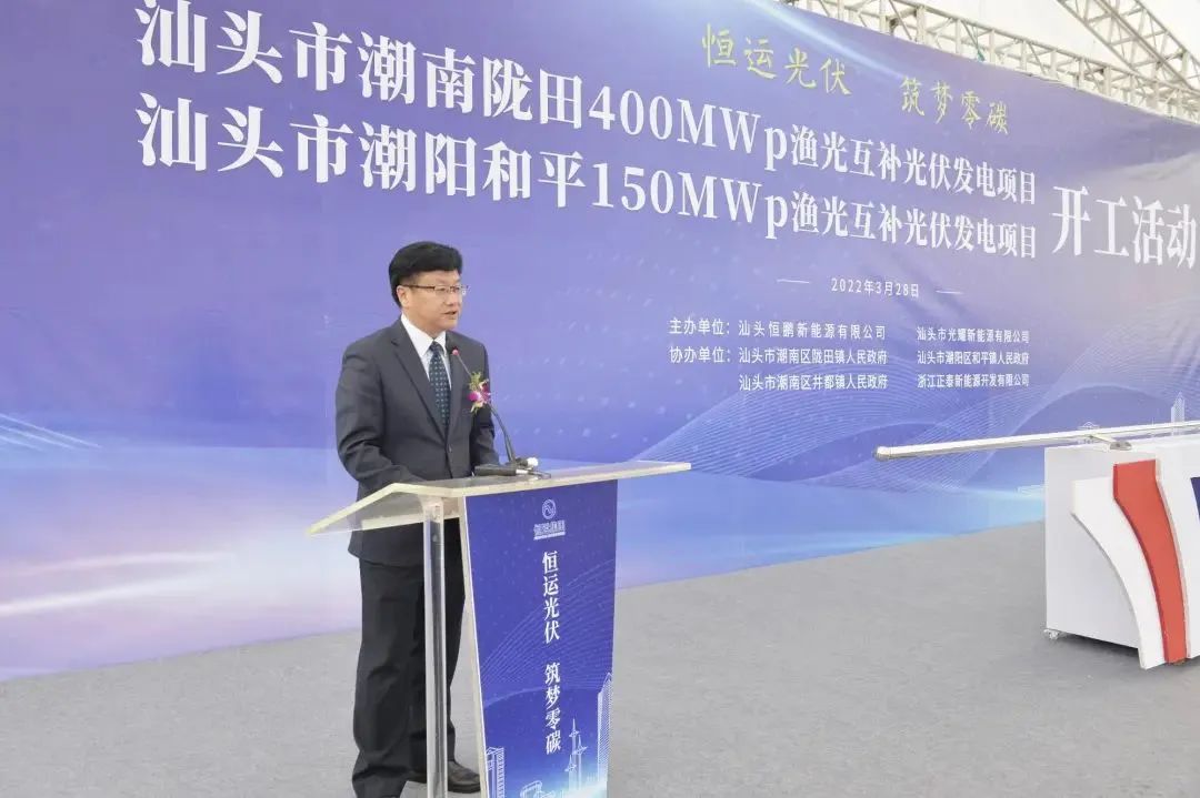 肖立在致辞中表示,在双碳目标推进的背景下,新能源产业迎来了重大发展机遇。汕头市发展光伏产业具有得天独厚的自然优势。此次开工建设的陇田、和平渔光互补光伏发电项目,聚焦汕头市构建“三新两特一大”新发展格局,助力汕头市加快构建清洁低碳,安全高效的现代能源体系,为区域实现双碳目标作出重要贡献。项目总投资约23亿元,设计容量550MW,是亚洲最大渔光互补光伏发电项目之一,建成后可累计实现工业产值65亿元,累计创造财政税收约13亿元。希望通过汕头市、区政府和各参建单位的共同努力,将项目建设成为新能源精品样板工程。