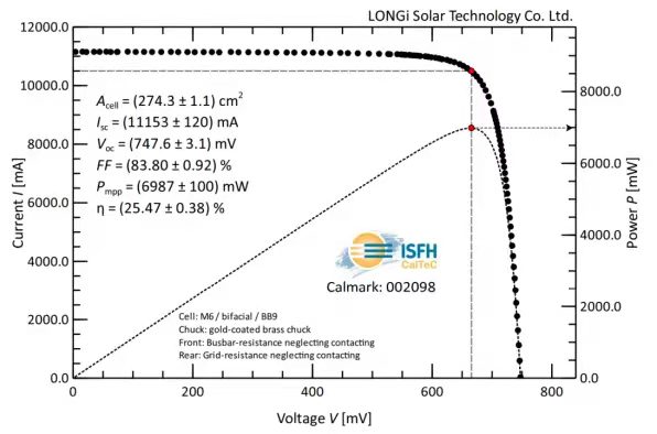 近日,经德国哈梅林太阳能研究所(ISFH)认证,隆基采用掺镓p型硅片制备的硅异质结电池(p-HJT)获得效率新突破:完全利用可量产工艺在全尺寸(M6尺寸,面积274.3cm2)单晶硅片上,创造了转换效率为25.47%的大尺寸p型光伏电池效率世界纪录,进一步验证了低成本异质结量产技术的可行性。