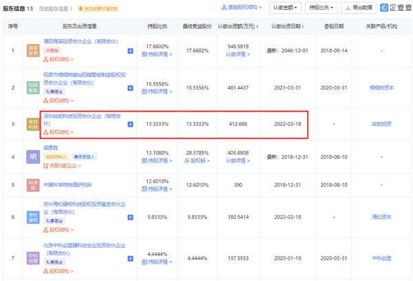 根据股东信息显示,深圳哈勃认缴出资额为412.666万元,持股比例为13.3333%。