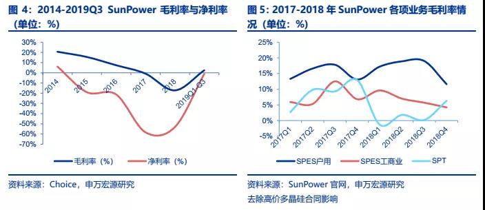 2018 年,SunPower 实现营业收入 123 亿元人民币(“元”指代人民币,以 1 元人民币兑 0.1429 美元汇率换算),同比降低 7.79%;实现归母净利润-57.94 亿元。2018 年受美国 201、301 法案影响,公司部分产品及进口电池片征收额外关税,毛利润仍旧承压,归母净利润好转主要受益于住宅租赁资产处置及减值损失同比减少。2019 年前三季度,SunPower 共实现营业收入 90.03 亿元,同比减少0.69%;实现归母净利润 1.19 亿元。得益于果断的战略转型,以及持续的成本优化措施,SunPower 业绩扭亏为盈。