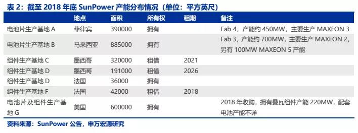 SunPower 主打产品为 P 系列叠瓦组件及MAXEON IBC 组件,产线专业化程度较高。截至 2018 年底,SunPower 共拥有 2 座电池工厂、4 座组件工厂、1 座电池及组件工厂。其中电池工厂分别布局在菲律宾和马来西亚,产能分别为 450MW 和 700MW,主要产品分别为 MAXEON 3 和 MAXEON 2(均为 IBC技术路线)。
