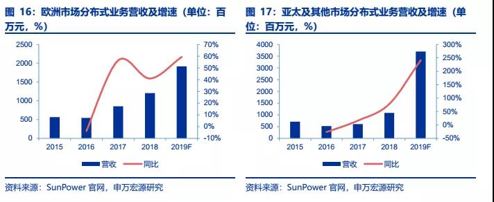 得益于高效产品的优异性能表现和全球化经销网络布局,SunPower 在欧洲及亚太地区的分布式市场取得良好成绩。2015-2019 年,欧洲市场分布式业务营收复合增速约 36%,亚太市场分布式业务营收复合增速约 51%。SunPower 在欧洲市场拥有 450 家以上的经销商网络,在澳大利亚拥有 200 家以上的经销商网络,在东南亚、非洲、拉美等地亦开展了大规模分销渠道建设。