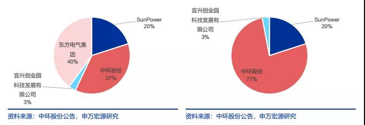 东方环晟成立于 2015 年 8 月,注册资本 11.76 亿元,东方电气集团、中环股份、SUNPOWER、宜兴创业园科技发展有限公司分别持股 40%、37%、20%、3%。东方环晟主要从事单晶 PERC 电池片、叠瓦组件的研发、生产和销售。2017 年 2 月,东方环晟引进股东 SUNPOWER 的全球专利高效叠瓦技术。2018 年底东方环晟有 11 条单晶电池生产线,具备 1.2GW 以上单晶电池生产能力,未来计划扩产 500MW-800MW SE PERC 电池;拥有 8 条高效叠瓦组件产线,具备2GW 组件产能。目前东方环晟已成为 SunPower P 系列组件产品最主要的生产基地,根据约定 SunPower 可以选择分销东方环晟的高效叠瓦组件产品。