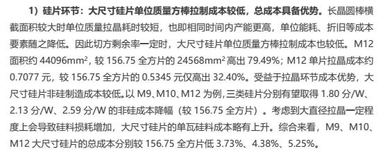 电池、组件环节生产设备一般具有固定通量,大尺寸硅片应用在一定程度上扩大了以功率计量的设备产能,从而摊薄单瓦投资/折旧成本。此外,化学试剂等耗材的单瓦用量,亦随硅片面积增大而减小。以 156.75 全方片为基准,M9、M10、M12 规格硅片分别将电池片环节的非硅成本降低了 15.26%、18.49%、22.49%。若综合考虑原材料硅片的成本降低(一体化测算),则 M9、M10、M12 规格硅片分别将电池片环节的总成本降低了 8.66%、10.41%、12.62%。