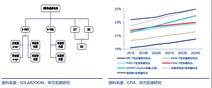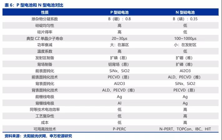 按照硅片性质将晶硅电池分为 N 型电池和 P 型电池。P 型电池只需要扩散一种杂质,成本较低,但少子寿命短,转化效率较低。N 型电池少子寿命长,转化效率高,难点在于需要扩散两种杂质,成本较高。电池发展前期受成本因素影响,大多进行 P 型电池生产,但 P 型电池在转换效率达到 22%后,即面临资本及技术投入边际效益率递减效应。而 N 型电池具有更高的效率和无衰减特性,单位面积土地上的发电量大,因此 N 型电池具有更大的潜力和市场空间,是未来主流的发展方向。